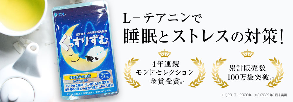 すこやかな睡眠(すっきりとした目覚め、疲労感の回復)、一過性作業のストレス緩和に。L-テアニン配合。