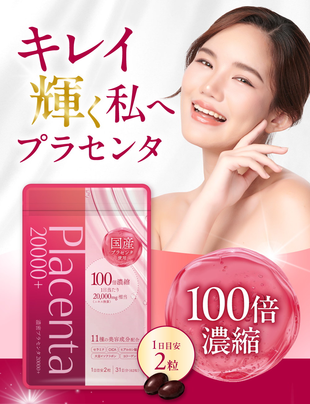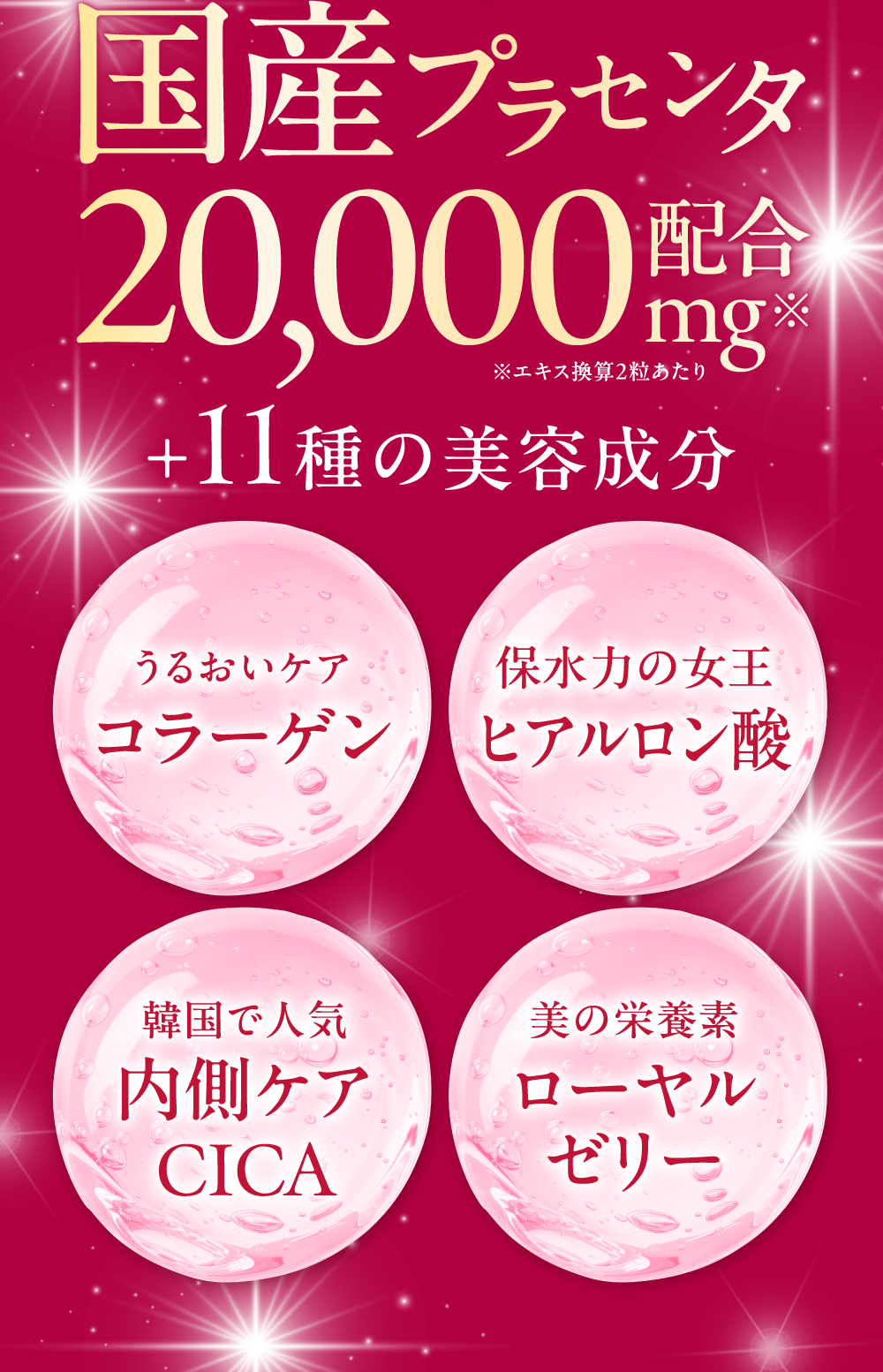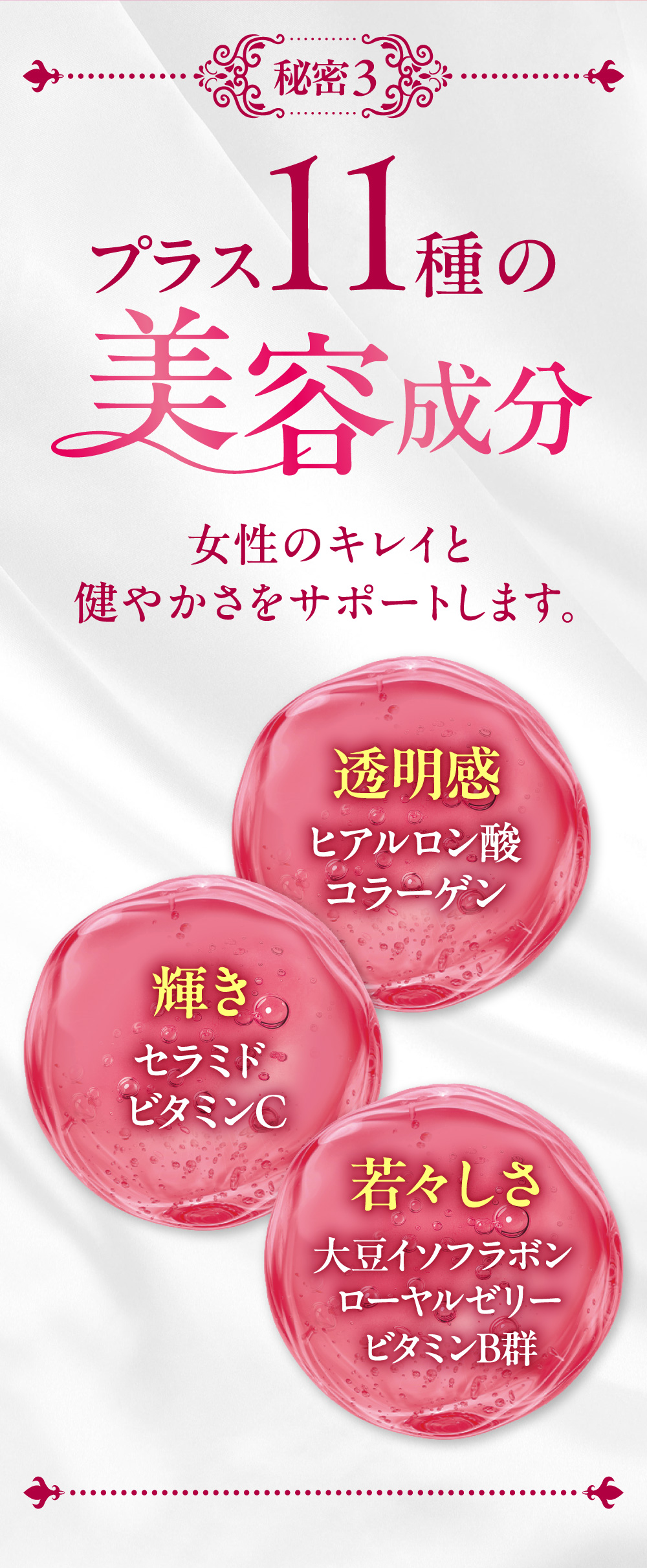 食用サフラワー油(国内製造)、プラセンタエキス末、コラーゲンペプチド、ヒアルロン酸、米胚芽抽出粉末、ツボクサ抽出物、大豆抽出物(イソフラボン含有)、ローヤルゼリー末/ゼラチン、グリセリン、グリセリン脂肪酸エステル、ミツロウ、カラメル色素、ビタミンB₆、ビタミンB₂、ビタミンB₁、ビタミンC、ビタミンB₁₂