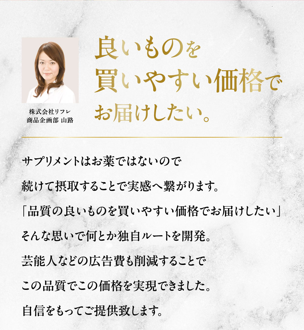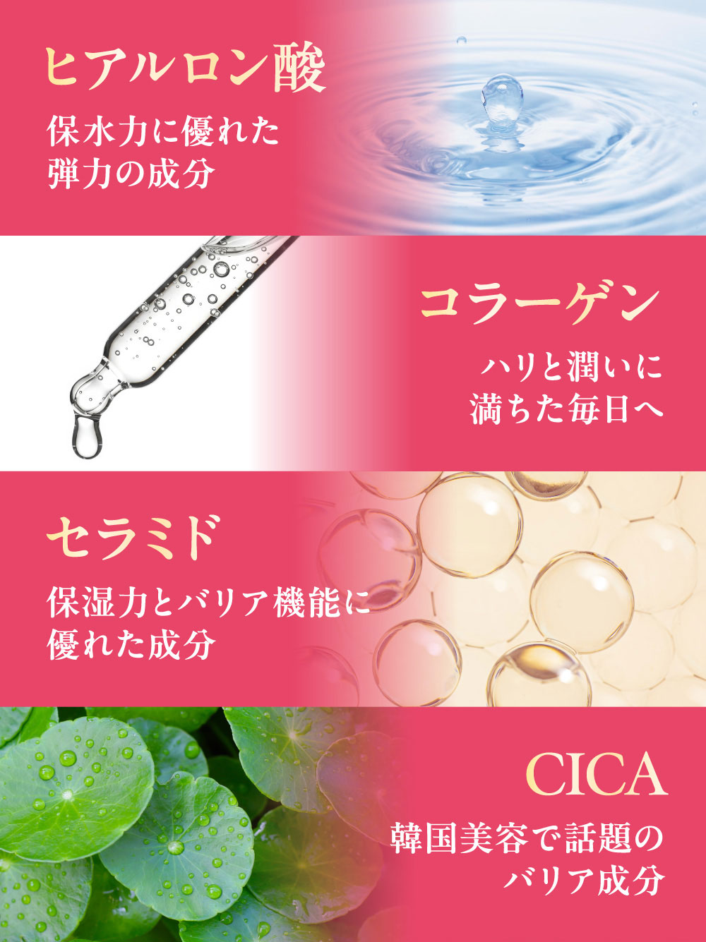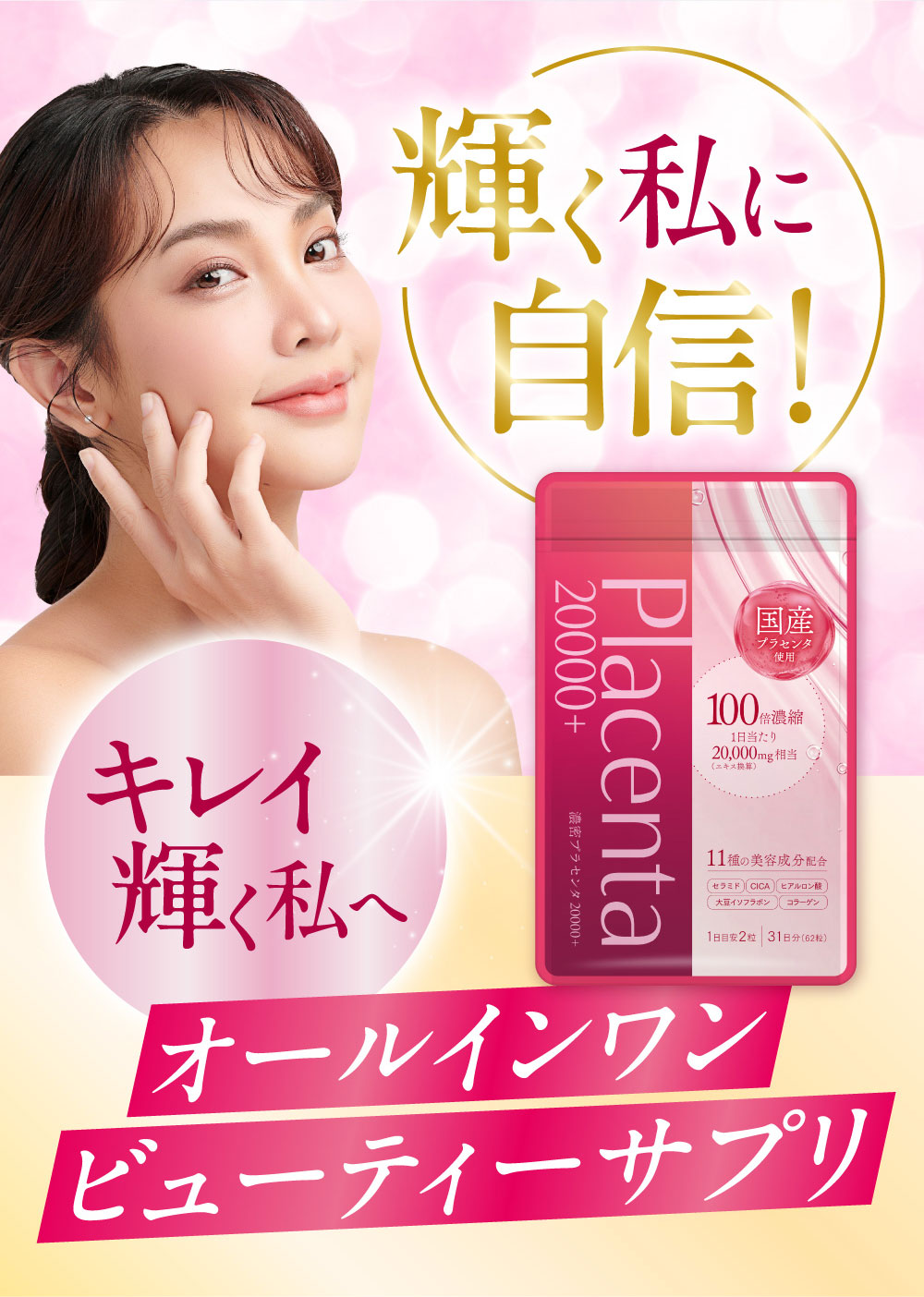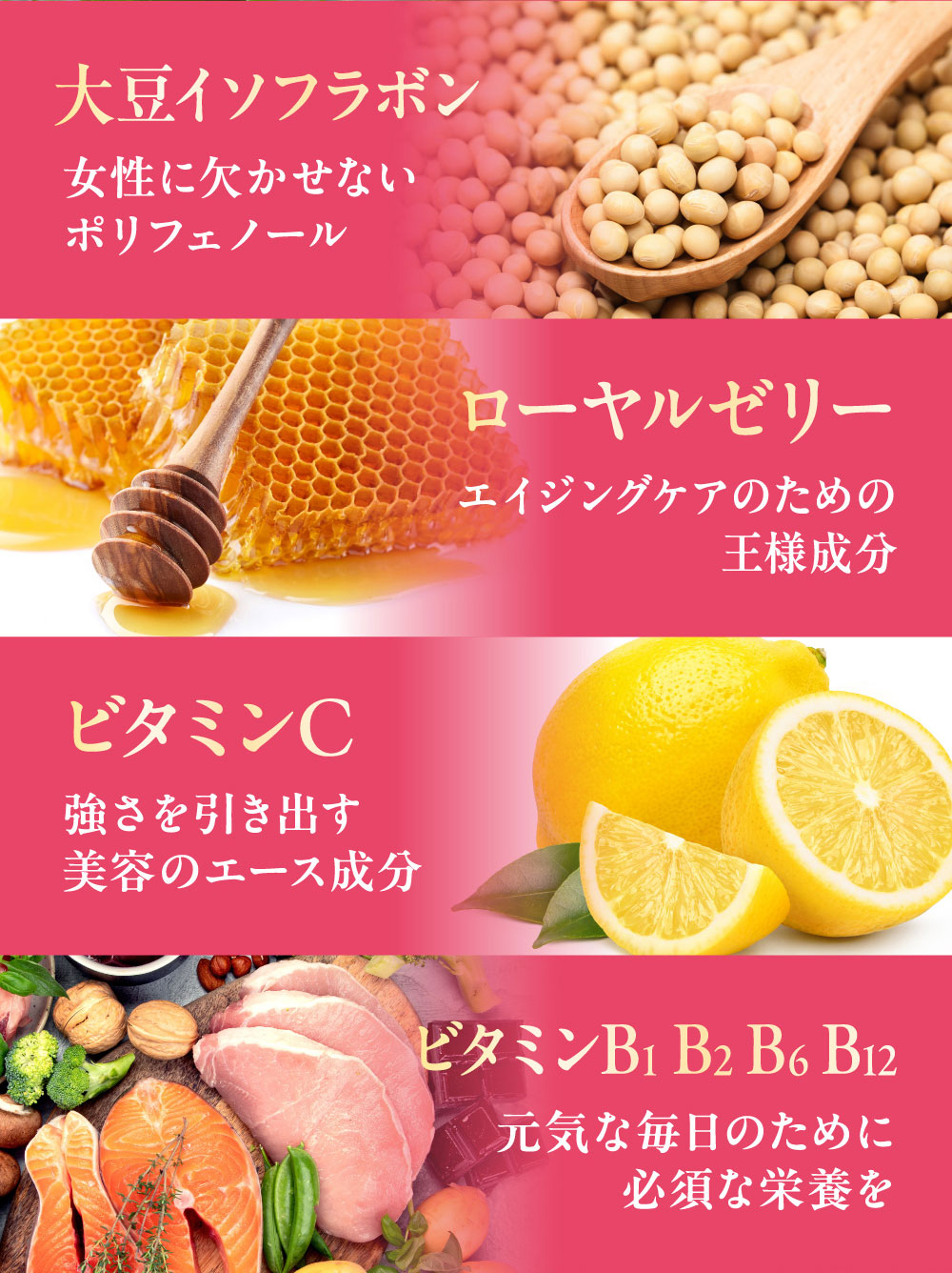 食用サフラワー油(国内製造)、プラセンタエキス末、コラーゲンペプチド、ヒアルロン酸、米胚芽抽出粉末、ツボクサ抽出物、大豆抽出物(イソフラボン含有)、ローヤルゼリー末/ゼラチン、グリセリン、グリセリン脂肪酸エステル、ミツロウ、カラメル色素、ビタミンB₆、ビタミンB₂、ビタミンB₁、ビタミンC、ビタミンB₁₂