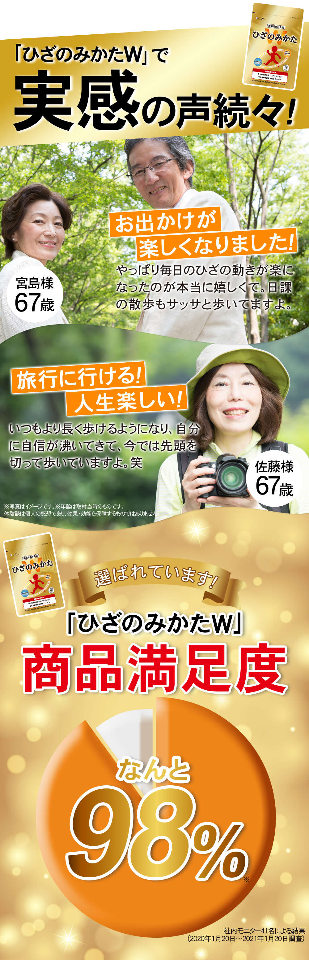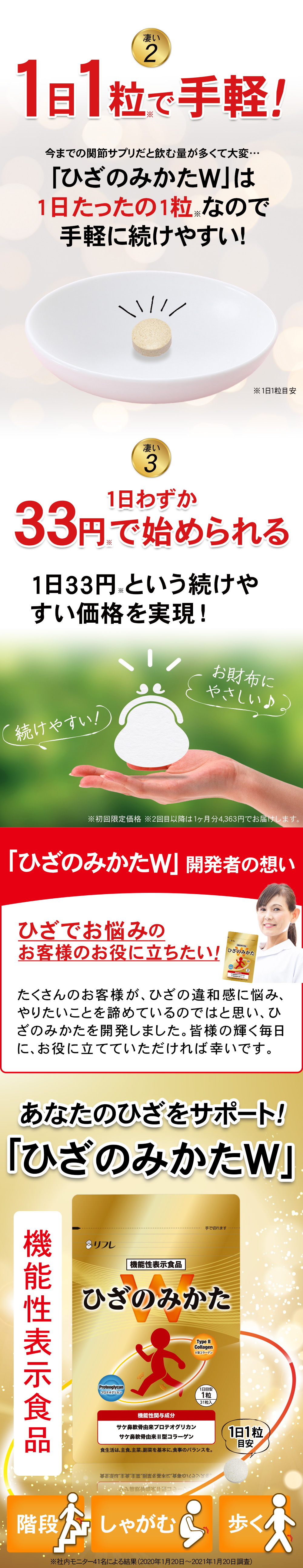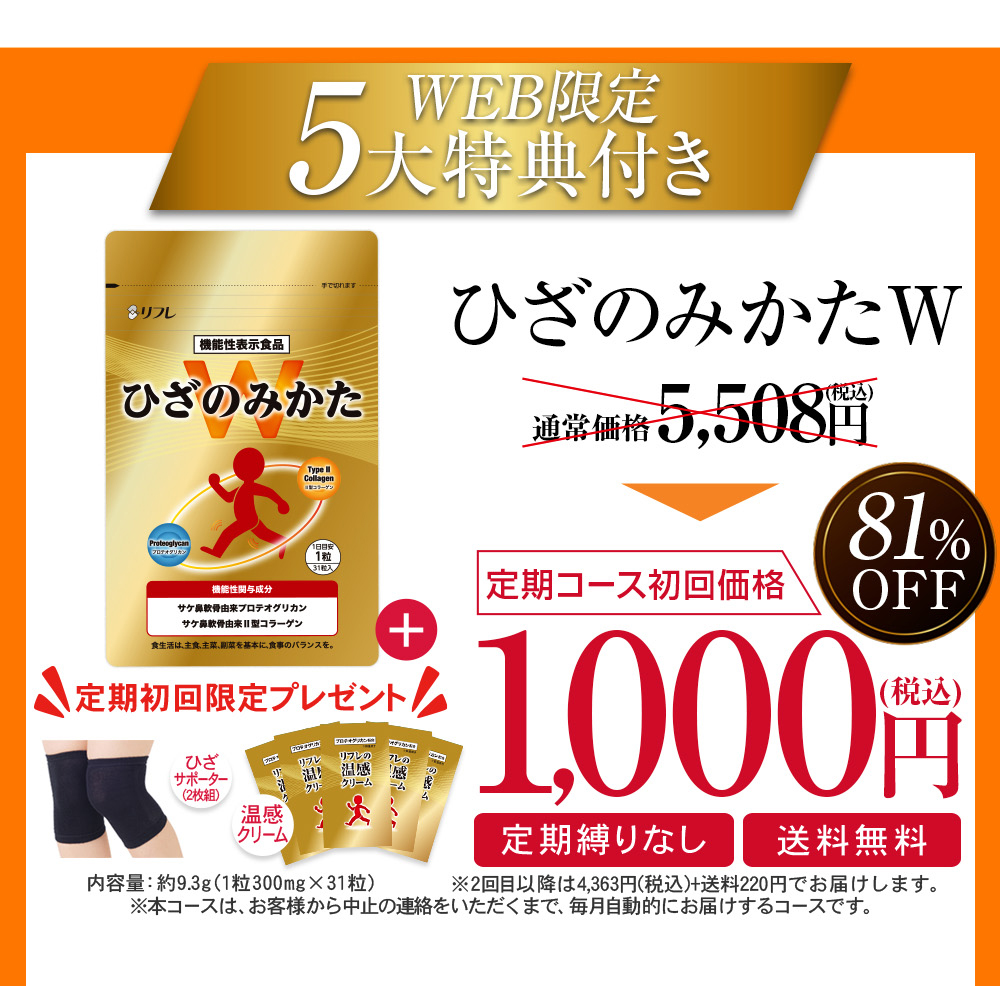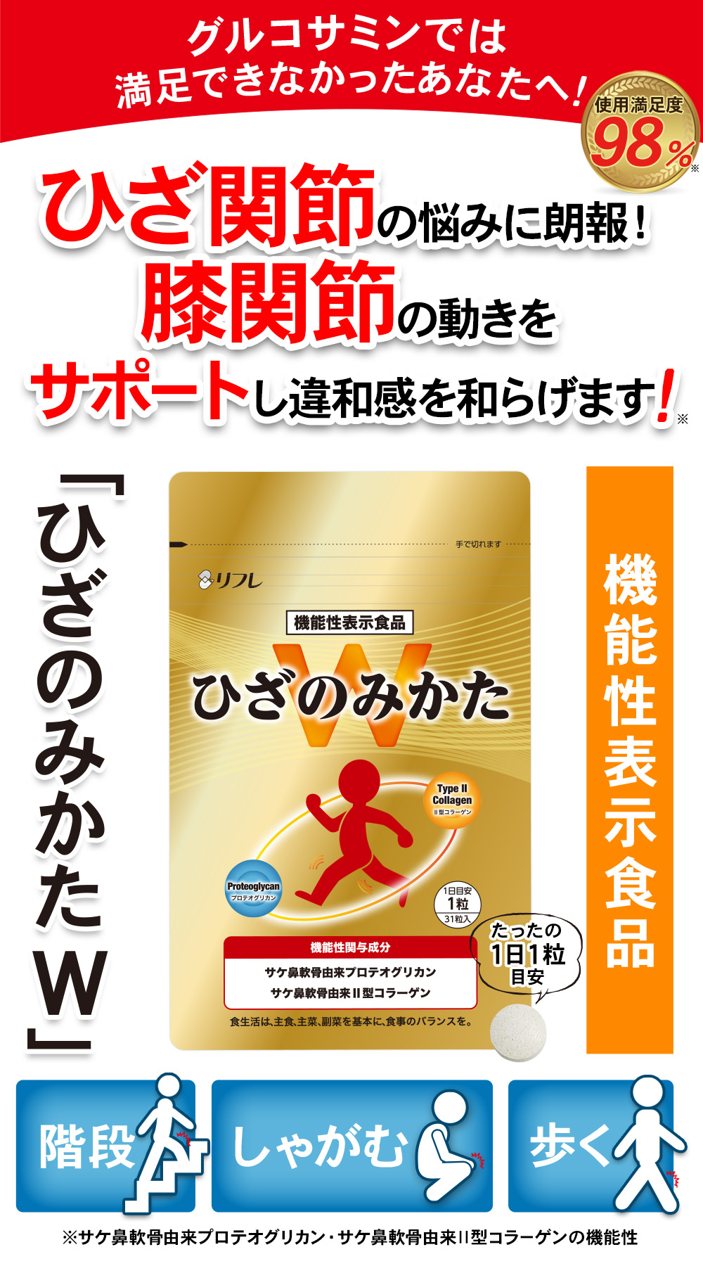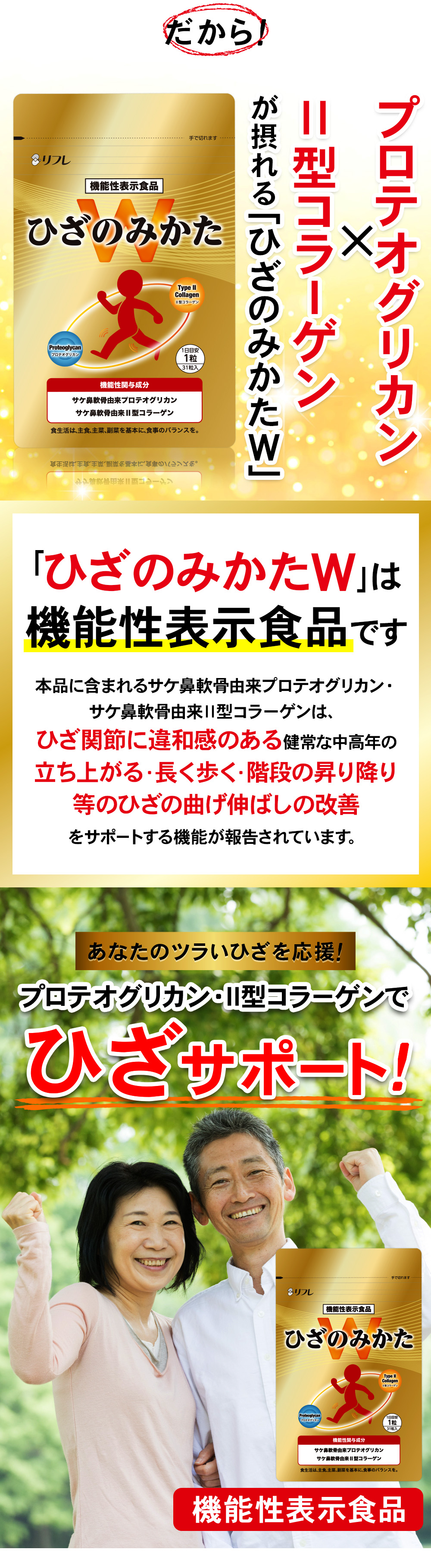 届出表示:本品には、サケ鼻軟骨由来プロテオグリカン・サケ鼻軟骨由来Ⅱ型コラーゲンが含まれます。サケ鼻軟骨由来プロテオグリカン・サケ鼻軟骨由来Ⅱ型コラーゲンは、日常生活の中で筋力の衰えを感じている方の年齢とともに低下する筋肉量の維持に役立つ機能と、ひざ関節に違和感のある健常な中高年の日常のひざ関節の動き(階段の昇り降り、歩く、しゃがむ等)をサポートし違和感を和らげる機能が報告されています。 本品は、事業者の責任において特定の保健の目的が期待できる旨を表示 するものとして、消費者庁長官に届出されたものです。ただし、特定保健用食品と異なり、消費者庁長官による個別審査を受けたものではありません。