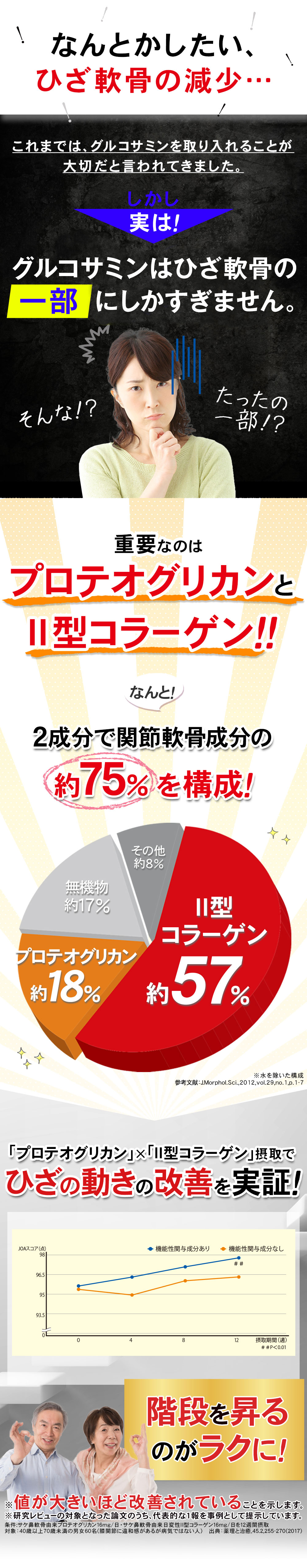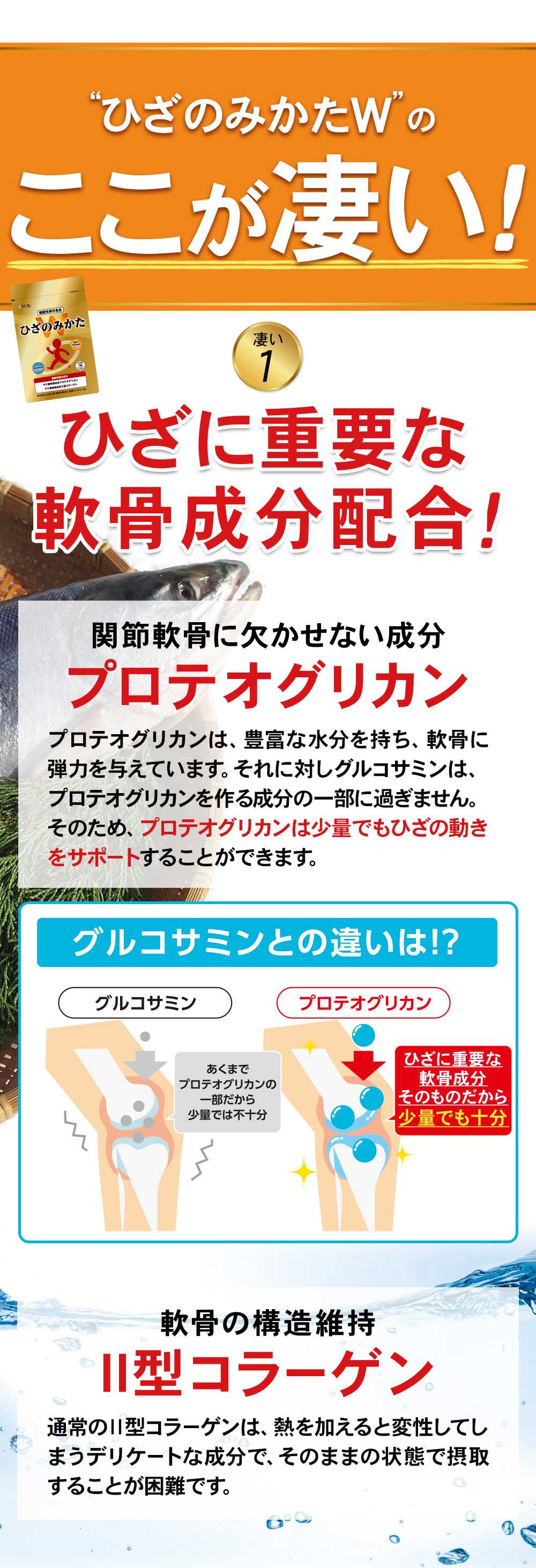プロテオグリカンは、軟骨成分そのものですが、グルコサミンは、プロテオグリカンを作る成分の一部にすぎません。またグルコサミンの場合、一日に1,500mg必要でしたが、プロテオグリカンは、わずか16mgでもひざの曲げ伸ばしの改善を助ける機能が実証されました。